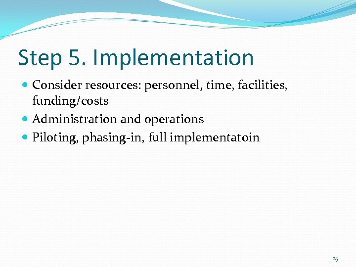 Step 5. Implementation Consider resources: personnel, time, facilities, funding/costs Administration and operations Piloting, phasing-in, full implementatoin 25