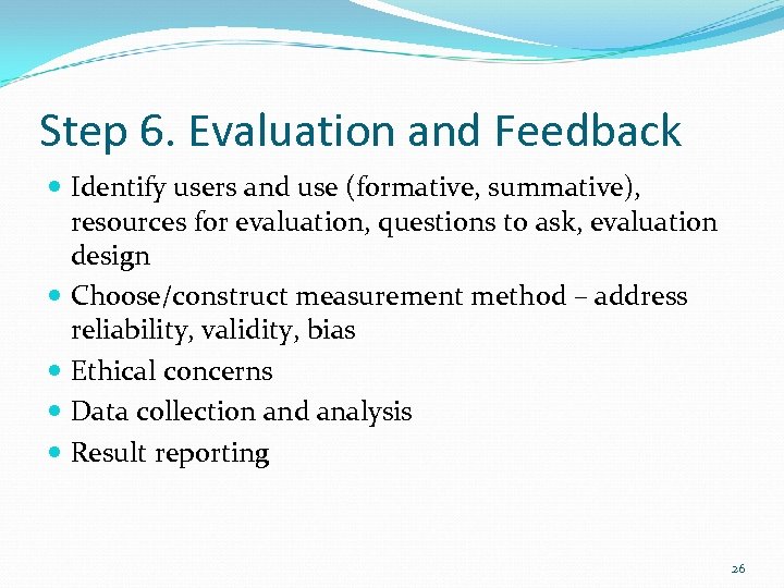 Step 6. Evaluation and Feedback Identify users and use (formative, summative), resources for evaluation, questions to ask, evaluation design Choose/construct measurement method – address reliability, validity, bias Ethical concerns Data collection and analysis Result reporting 26