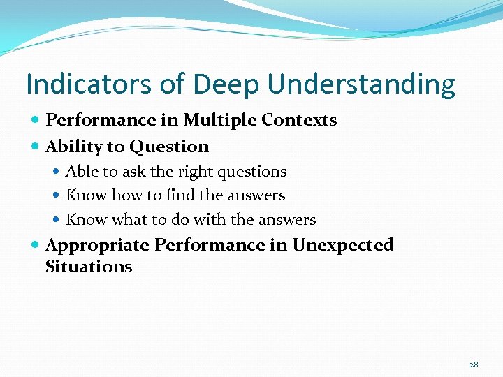 Indicators of Deep Understanding Performance in Multiple Contexts Ability to Question Able to ask the right questions Know how to find the answers Know what to do with the answers Appropriate Performance in Unexpected Situations 28