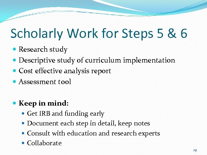 Scholarly Work for Steps 5 & 6 Research study Descriptive study of curriculum implementation Cost effective analysis report Assessment tool Keep in mind: Get IRB and funding early Document each step in detail, keep notes Consult with education and research experts Collaborate 29