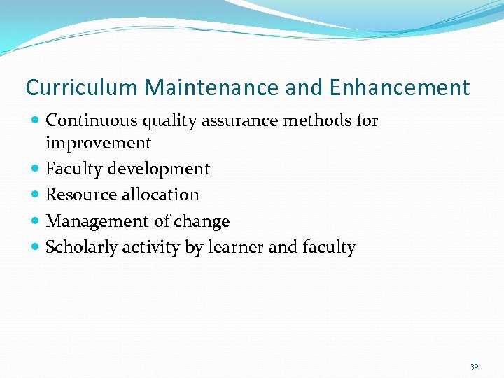 Curriculum Maintenance and Enhancement Continuous quality assurance methods for improvement Faculty development Resource allocation Management of change Scholarly activity by learner and faculty 30
