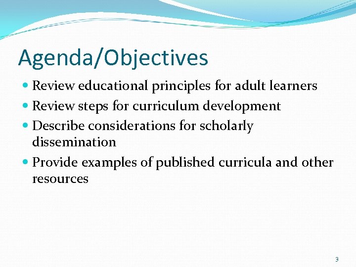 Agenda/Objectives Review educational principles for adult learners Review steps for curriculum development Describe considerations for scholarly dissemination Provide examples of published curricula and other resources 3