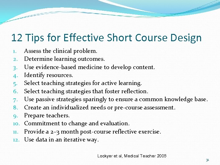12 Tips for Effective Short Course Design 1. 2. 3. 4. 5. 6. 7. 8. 9. 10. 11. 12. Assess the clinical problem. Determine learning outcomes. Use evidence-based medicine to develop content. Identify resources. Select teaching strategies for active learning. Select teaching strategies that foster reflection. Use passive strategies sparingly to ensure a common knowledge base. Create an individualized needs or pre-course assessment. Prepare teachers. Commitment to change and evaluation. Provide a 2– 3 month post-course reflective exercise. Use data in an iterative way. Lockyer et al, Medical Teacher 2005 31