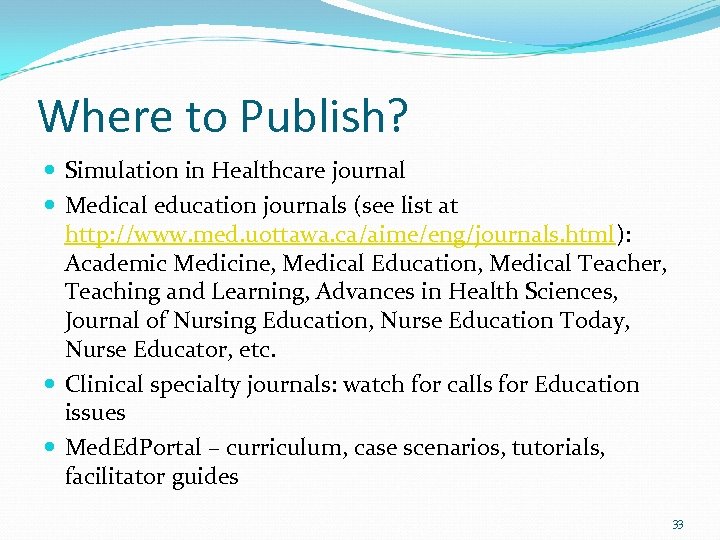 Where to Publish? Simulation in Healthcare journal Medical education journals (see list at http: //www. med. uottawa. ca/aime/eng/journals. html): Academic Medicine, Medical Education, Medical Teacher, Teaching and Learning, Advances in Health Sciences, Journal of Nursing Education, Nurse Education Today, Nurse Educator, etc. Clinical specialty journals: watch for calls for Education issues Med. Ed. Portal – curriculum, case scenarios, tutorials, facilitator guides 33