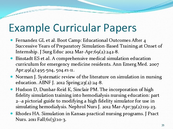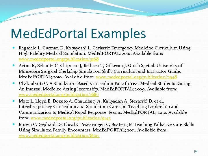 Med. Ed. Portal Examples Ragsdale L, Gutman D, Kobayashi L. Geriatric Emergency Medicine Curriculum Using High Fidelity Medical Simulation. Med. Ed. PORTAL; 2010. Available from: www. mededportal. org/publication/3168 Acton R, Schmitz C, Chipman J, Reihsen T, Gilkeson J, Groth S, et al. University of Minnesota Surgical Clerkship Simulation Skills Curriculum and Instructor Guide. Med. Ed. PORTAL; 2010. Available from: www. mededportal. org/publication/7948 Chakraborti C. A Simulation-Based Curriculum For 4 th Year Medical Students During An Internal Medicine Acting Internship. Med. Ed. PORTAL; 2009. Available from: www. mededportal. org/publication/1687 Motz L, Lloyd B, Donato A, Chaudhary A, Kaliyadan A, Stavarski D, et al. Interdisciplinary Curriculum and Simulation Cases for Teaching Leadership and Communication to Medical Rapid Response Teams. Med. Ed. PORTAL; 2012. Available from: www. mededportal. org/publication/9145 Brown C, Gephardt G, Lloyd C, Swearingen C, Boateng B. Teaching Palliative Care Skills Using Simulated Family Encounters. Med. Ed. PORTAL; 2011. Available from: www. mededportal. org/publication/8507 34