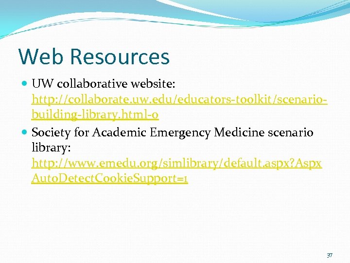 Web Resources UW collaborative website: http: //collaborate. uw. edu/educators-toolkit/scenariobuilding-library. html-0 Society for Academic Emergency Medicine scenario library: http: //www. emedu. org/simlibrary/default. aspx? Aspx Auto. Detect. Cookie. Support=1 37