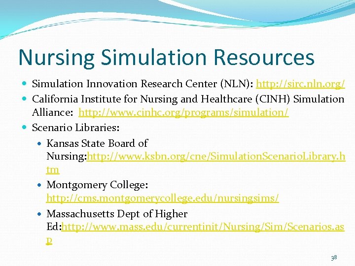 Nursing Simulation Resources Simulation Innovation Research Center (NLN): http: //sirc. nln. org/ California Institute for Nursing and Healthcare (CINH) Simulation Alliance: http: //www. cinhc. org/programs/simulation/ Scenario Libraries: Kansas State Board of Nursing: http: //www. ksbn. org/cne/Simulation. Scenario. Library. h tm Montgomery College: http: //cms. montgomerycollege. edu/nursingsims/ Massachusetts Dept of Higher Ed: http: //www. mass. edu/currentinit/Nursing/Sim/Scenarios. as p 38