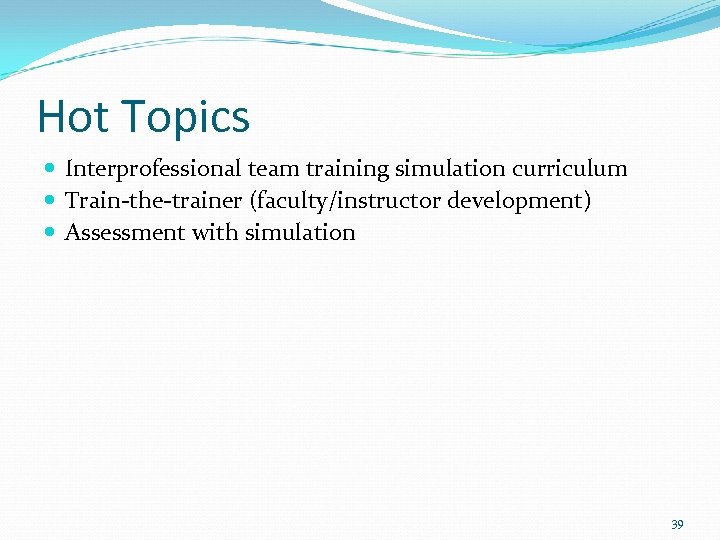 Hot Topics Interprofessional team training simulation curriculum Train-the-trainer (faculty/instructor development) Assessment with simulation 39