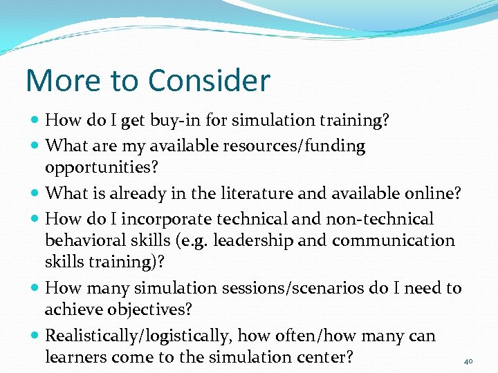 More to Consider How do I get buy-in for simulation training? What are my available resources/funding opportunities? What is already in the literature and available online? How do I incorporate technical and non-technical behavioral skills (e. g. leadership and communication skills training)? How many simulation sessions/scenarios do I need to achieve objectives? Realistically/logistically, how often/how many can learners come to the simulation center? 40
