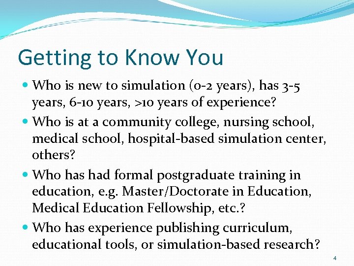 Getting to Know You Who is new to simulation (0 -2 years), has 3 -5 years, 6 -10 years, >10 years of experience? Who is at a community college, nursing school, medical school, hospital-based simulation center, others? Who has had formal postgraduate training in education, e. g. Master/Doctorate in Education, Medical Education Fellowship, etc. ? Who has experience publishing curriculum, educational tools, or simulation-based research? 4