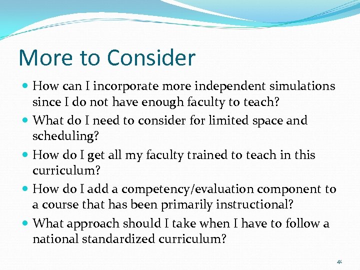 More to Consider How can I incorporate more independent simulations since I do not have enough faculty to teach? What do I need to consider for limited space and scheduling? How do I get all my faculty trained to teach in this curriculum? How do I add a competency/evaluation component to a course that has been primarily instructional? What approach should I take when I have to follow a national standardized curriculum? 41