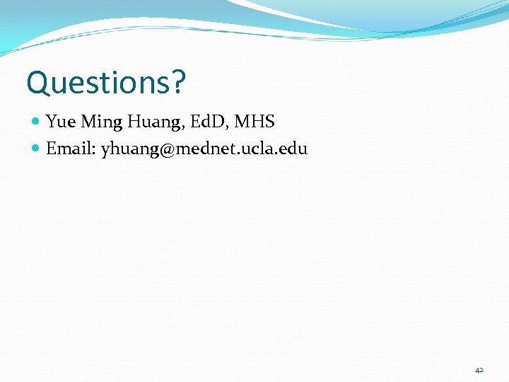 Questions? Yue Ming Huang, Ed. D, MHS Email: yhuang@mednet. ucla. edu 42
