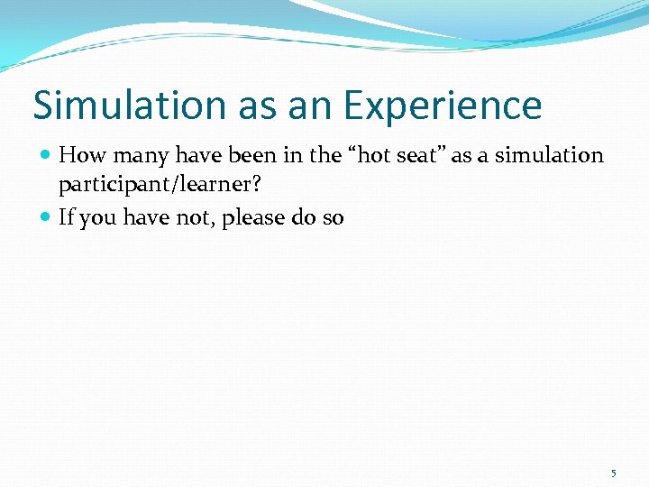 Simulation as an Experience How many have been in the “hot seat” as a simulation participant/learner? If you have not, please do so 5