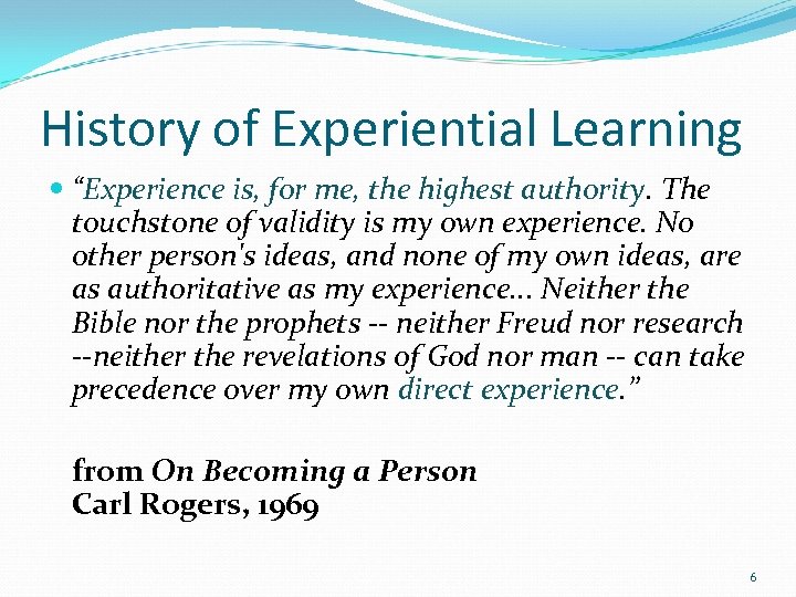 History of Experiential Learning “Experience is, for me, the highest authority. The touchstone of validity is my own experience. No other person's ideas, and none of my own ideas, are as authoritative as my experience. . . Neither the Bible nor the prophets -- neither Freud nor research --neither the revelations of God nor man -- can take precedence over my own direct experience. ” from On Becoming a Person Carl Rogers, 1969 6