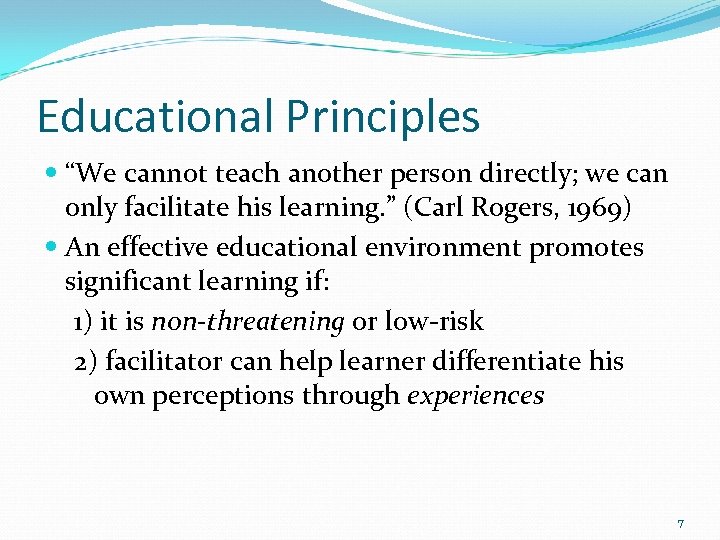 Educational Principles “We cannot teach another person directly; we can only facilitate his learning. ” (Carl Rogers, 1969) An effective educational environment promotes significant learning if: 1) it is non-threatening or low-risk 2) facilitator can help learner differentiate his own perceptions through experiences 7
