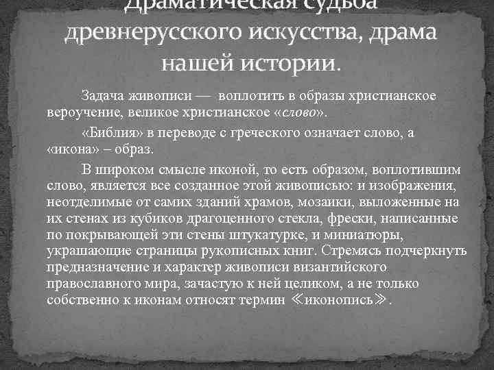 Драматическая судьба древнерусского искусства, драма нашей истории. Задача живописи — воплотить в образы христианское вероучение, великое христианское «слово» . «Библия» в переводе с греческого означает слово, а «икона» – образ. В широком смысле иконой, то есть образом, воплотившим слово, является все созданное этой живописью: и изображения, неотделимые от самих зданий храмов, мозаики, выложенные на их стенах из кубиков драгоценного стекла, фрески, написанные по покрывающей эти стены штукатурке, и миниатюры, украшающие страницы рукописных книг. Стремясь подчеркнуть предназначение и характер живописи византийского православного мира, зачастую к ней целиком, а не только собственно к иконам относят термин ≪иконопись≫.