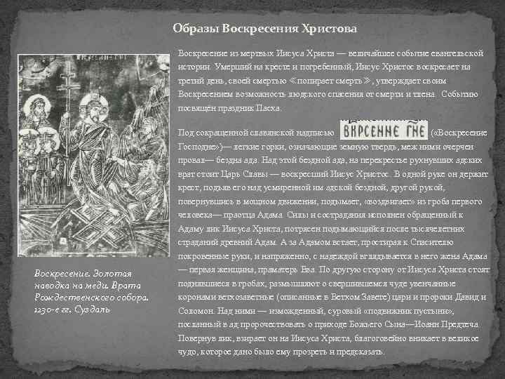 Образы Воскресения Христова Воскресение из мертвых Иисуса Христа — величайшее событие евангельской истории. Умерший на кресте и погребенный, Иисус Христос воскресает на третий день, своей смертью ≪попирает смерть≫, утверждает своим Воскресением возможность людского спасения от смерти и тлена. Событию посвящён праздник Пасха. Воскресение. Золотая наводка на меди. Врата Рождественского собора. 1230 -е гг. Суздаль Под сокращенной славянской надписью ( «Воскресение Господне» )— легкие горки, означающие земную твердь, меж ними очерчен провал— бездна ада. Над этой бездной ада, на перекрестье рухнувших адских врат стоит Царь Славы — воскресший Иисус Христос. В одной руке он держит крест, подъяв его над усмиренной им адской бездной, другой рукой, повернувшись в мощном движении, подымает, «воздвигает» из гроба первого человека— праотца Адама. Силы и сострадания исполнен обращенный к Адаму лик Иисуса Христа, потрясен подымающийся после тысячелетних страданий древний Адам. А за Адамом встает, простирая к Спасителю покровенные руки, и напряженно, с надеждой вглядывается в него жена Адама — первая женщина, праматерь Ева. По другую сторону от Иисуса Христа стоят поднявшиеся в гробах, размышляют о свершившемся чуде увенчанные коронами ветхозаветные (описанные в Ветхом Завете) цари и пророки Давид и Соломон. Над ними — изможденный, суровый «подвижник пустыни» , посланный в ад пророчествовать о приходе Божьего Сына—Иоанн Предтеча. Повернув лик, взирает он на Иисуса Христа, благоговейно вникает в великое чудо, которое дано было ему прозреть и предсказать.