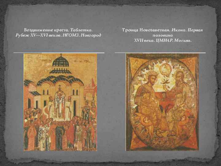 Воздвижение креста. Таблетка. Рубеж XV—XVI веков. НГОМЗ. Новгород Троица Новозаветная. Икона. Первая половина XVII века. ЦМИАР. Москва.