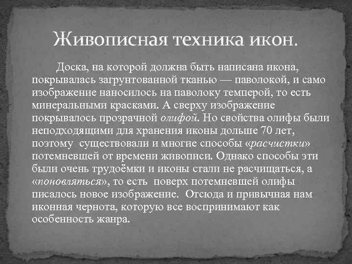 Живописная техника икон. Доска, на которой должна быть написана икона, покрывалась загрунтованной тканью — паволокой, и само изображение наносилось на паволоку темперой, то есть минеральными красками. А сверху изображение покрывалось прозрачной олифой. Но свойства олифы были неподходящими для хранения иконы дольше 70 лет, поэтому существовали и многие способы «расчистки» потемневшей от времени живописи. Однако способы эти были очень трудоёмки и иконы стали не расчищаться, а «поновляться» , то есть поверх потемневшей олифы писалось новое изображение. Отсюда и привычная нам иконная чернота, которую все воспринимают как особенность жанра.