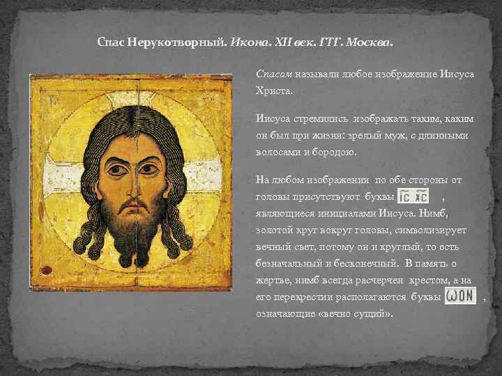 Спас Нерукотворный. Икона. XII век. ГТГ. Москва. Спасом называли любое изображение Иисуса Христа. Иисуса стремились изображать таким, каким он был при жизни: зрелый муж, с длинными волосами и бородою. На любом изображении по обе стороны от головы присутствуют буквы , являющиеся инициалами Иисуса. Нимб, золотой круг вокруг головы, символизирует вечный свет, потому он и круглый, то есть безначальный и бесконечный. В память о жертве, нимб всегда расчерчен крестом, а на его перекрестии располагаются буквы означающие «вечно сущий» . ,