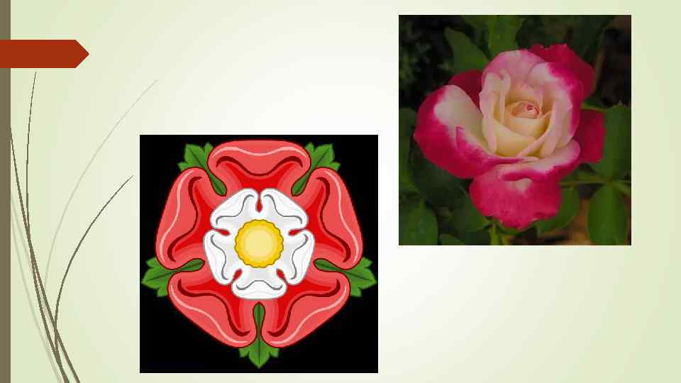 Роза Тюдоров Выбор растения-символа определяется разными обстоятельствами: Происхождение символа ассоциируется с преданиями и легендами, передающими информацию о прошлом; В случае с Англией определяющим явилось последнее обстоятельство – растительный символ Англии появился благодаря историческому событию – Войне Роз. Отныне цветок - символ Англии изображали как белую розу Йорка, обведённую лепестками красной розы Ланкастеров.
