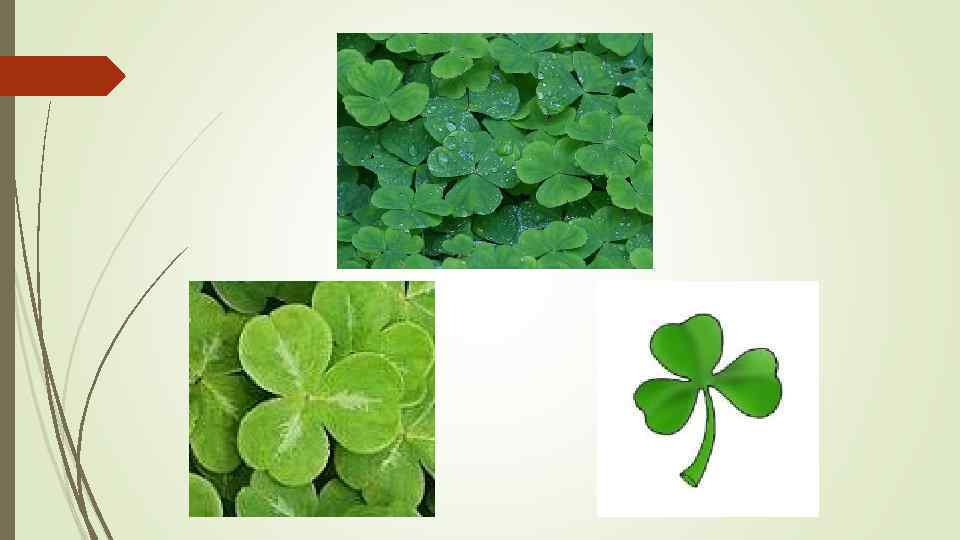 Цветок клевера Национальным символом Ирландии считается цветок клевера, который, как правило, изображается в виде трех соединенных, похожих на сердце, листков. В древние времена друиды, использовали клевер, символизирующий, по их мнению, природный баланс, для своих магических обрядов — например, изгоняли с его помощью дьявола.