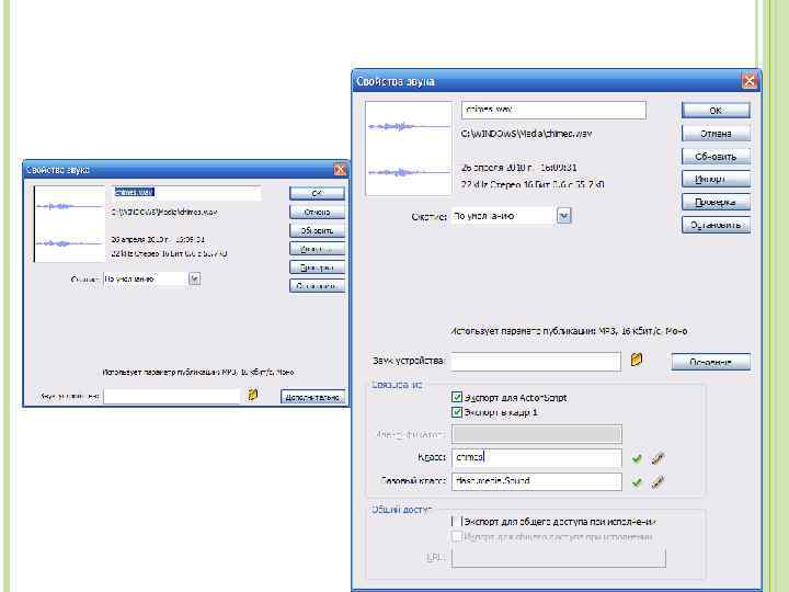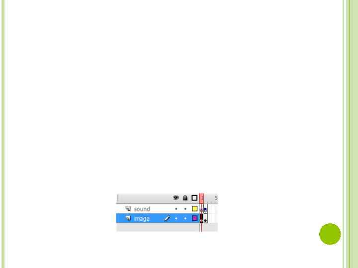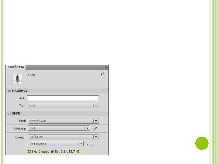 Синхронизация звука Существуют два способа синхронизации звука: 1. Событийный тип. В этом случае воспроизведение событийного звука начинается при возникновении какого-либо события (например, наведение указателя мыши или достижение конкретного кадра на временной шкале). После запуска такой звук воспроизводится независимо от временной шкалы, даже если он хранится в единственном кадре. Недостаток: событийные звуки должны быть полностью загружены до начала их использования, то есть, если такой звук поместить в первый кадр фильма, то пользователю придется дождаться завершения загрузки звука. 2. Альтернативой может служить использование потокового звука, который начинает воспроизводиться сразу после момента начала загрузки. Именно поэтому именно потоковый звук используют для звукового сопровождения фильма. Потоковый звук привязан к временной шкале, если временная шкала содержит меньше кадров, чем длится звук, то последний останавливается при достижении последнего кадра.