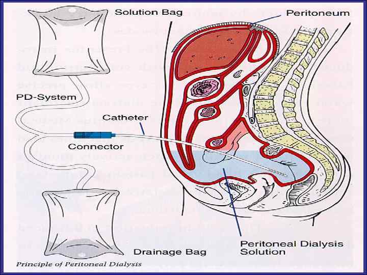 Перитонеальный диализ (ПД) Наличие в организме естественных полупроницаемых мембран, таких как брюшина, плевра, перикард, мочевой пузырь, базальная мембрана клубочков почек и даже матка, позволило поставить вопрос о возможности и целесообразности их использования для внепочечного очищения организма. Различные способы очищения организма с помощью промывания желудка и кишечника также основаны на принципе диализа и хорошо известны.