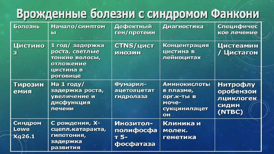 КЛИНИЧЕСКАЯ КАРТИНА • Симптомы: отставание в росте, рахит, полиурия. • Лабораторно: ацидоз, гипокалиемия, гипофосфатемия, гипокальциемия. • В моче: глюкозурия, аминоацидурия, потеря HCO 3, P, K, Ca.