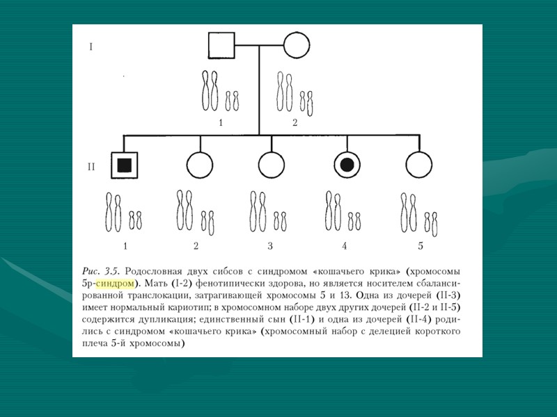 Генетика Кариотип 46 XX, 5p- или 46 ХУ, 5р-. Цитогенетически у всех больных обнаруживается укорочение приблизительно на треть и более короткого плеча одного из гомологов 5-й хромосомы. В коротком плече находится участок (15,1-15,2), который непосредственно вызывает развитие этого синдрома. Кроме обычной делеции, хромосомная перестройка может быть представлена другими вариантами (кольцевая хромосома, транслокация, мозаицизм по делеции).