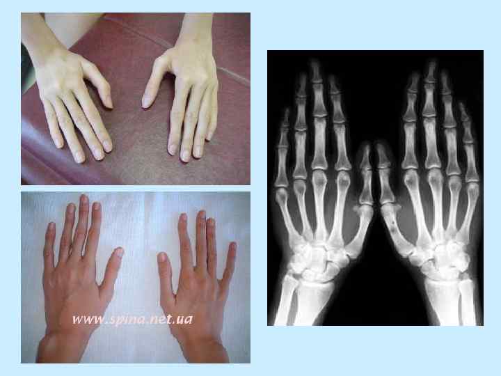 Минимальные диагностические признаки: - высокий рост - арахнодактилия - гиперподвижность суставов - подвывих хрусталика - расширение корня аорты - эктазия твердой мозговой оболочки люмбосакрального отдела спинного мозга