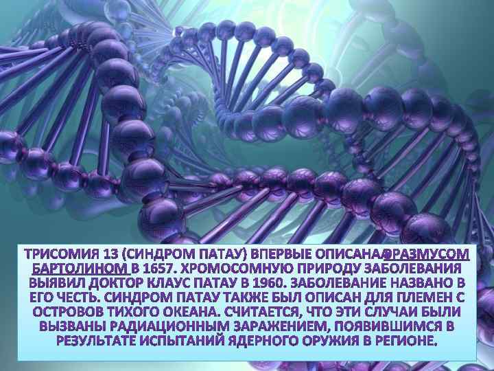 При синдроме Патау наблюдаются тяжелые врожденные пороки. Дети с синдромом Патау рождаются с массой тела ниже нормы (2500 г). У них выявляются умеренная микроцефалия (Череп меньше, чем должен быть), нарушение развития различных отделов ЦНС, низкий скошенный лоб, суженные глазные щели, расстояние между которыми уменьшено, помутнение роговицы, запавшая переносица, широкое основание носа, деформированные ушные раковины, расщелина верхней губы и нёба, полидактилия, флексорное положение кистей, короткая шея. У 80 % новорожденных встречаются пороки развития сердца: дефекты межжелудочковой и межпредсердной перегородок, транспозиции сосудов и др. Наблюдаются фиброкистозные изменения поджелудочной железы, добавочные селезёнки, эмбриональная пупочная грыжа. Почки увеличены, имеют повышенную дольчатость и кисты в корковом слое, выявляются пороки развития половых органов. Для СП характерна задержка умственного развития.