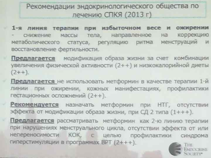 АЛГОРИТМ ОБСЛЕДОВАНИЯ ЖЕНЩИН ПРИ ПОДОЗРЕНИИ НА СПЯ 1. Анамнез и жалобы больной. 2. Данные гинекологического осмотра (гирсутное число, шкала Ферримана – Голлвея) 3. Данные фолликулометрии. 4. Гормональные исследования: ЛГ, ФСГ, ПРЛ, тестостерона, эстрадиола, ДГЭА-с, 17 - оксипрогестерона, ГСПГ (на 3– 5 й день цикла), ТТГ. 5. Определение уровня глюкозы в плазме венозной крови и ИРИ натощак и/или проведение ОГТТ (75 г сухой глюкозы) при повышении гликемии натощак. Оценка относительной ИР. 6. Определение показателей липидного обмена: холестерин, триглицериды, ЛПВП, ЛПНП. 7. По показаниям: консультация невропатолога, окулиста, психотерапевта. Consensus on women’s health aspects of polycystic ovary syndrome (PCOS): the Amsterdam ESHRE/ ASRMSponsored 3 rd PCOS Consensus Workshop Group. Fertility and Sterility 2012; 97(1), 28 -38.