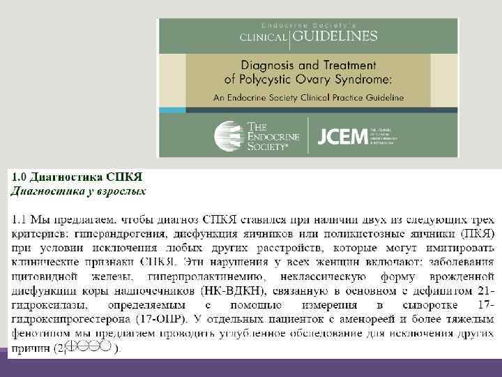 РАСПРОСТРАНЕННОСТЬ СПЯ – наиболее частая эндокринная патология у женщин¹ По разным данным СПЯ встречается в популяции от 10% (National Institute of Health)¹ до 16, 6% (Rotterdam Criteria)² У пациенток с СПЯ гиперандрогения встречается в 70– 80% случаев 3 ¹Fauser B. , Tarlatzis B. , Rebar R. et al. Consensus on women’s health aspects of polycystic ovary syndrome (PCOS): the Amsterdam ESHRE/ASRM-Sponsored 3 rd PCOS Consensus Workshop Group. Fertil Steril 2012; 97: 28– 38; ²Lauritsen MP et al. The prevalence of polycystic ovary in a normal population according to the Rotterdam criteria versus revised criteria including anti-Mullerian hormone. Hum Reprod. 2014 Apr; 29(4): 791 -801; 3 Moran, LJ, Misso, ML, Wild RA, et al. Impaired glucose tolerance, type 2 diabetes and metabolic syndrome in polycystic ovary syndrome: a systematic review and meta-analysis. Hum Reprod Update 2010; 16: 347– 363.