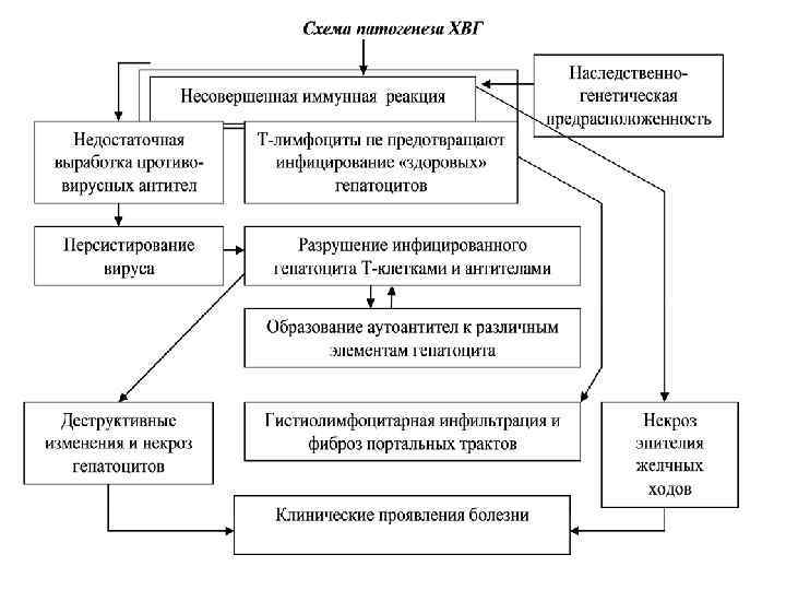 Патогенез хронического гепатита В Сам вирус гепатита В не цитопатогенен в отношении гепатоцита. Развитие заболевания зависит от изменений, происходящих в фазе репликации вируса; характера и выраженности иммунного ответа; выраженности аутоиммунных механизмов; активизации соединительной ткани; в печени и процессов активации перекисного окисления липидов (ПОЛ). После того, как вирус гепатита В проникает в кровоток, он с помощью белков pre-S 1 и S 2 проникает в гепатоцит, где происходит фаза репликации вируса, т. е. в гепатоцитах вырабатывается большое количество новых вирусных частиц. В ходе фазы репликации вируса происходит изменение гепатоцитов, в ряде случаев появляются «мутантные гапатоциты» , т. е. на поверхности гепатоцитов появляются как вирусные, так и вирус-индуцированные неоантигены. В ответ на это развивается иммунный ответ организма с повреждением гепатоцитов, что и определяет форму ХГ. При ХГ активируется соединительная ткань в печени. Причина активации не ясна, но предполагается, что она вызывается гибелью гепатоцитов, паренхимы печени. Активированная соединительная ткань оказывает повреждающее влияние на интактные гепатоциты, что способствует развитию ступенчатых некрозов и самопрогрессированию активного гепатита. ПОЛ значительное активируется при ХВГ-В, особенно при ХАГ. В результате активации ПОЛ образуются свободные радикалы и перекиси, которые стимулируют процессы фиброзообразования в печени и способствуют цитолизу гепатоцитов