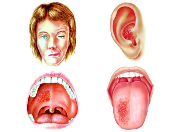 Клиническая картина: • Периодические или постоянные боли возникают преимущественно в области уха ; • Иррадиация болей в затылок, лицо, шею; • Появляются высыпания, которые определяются зоной иннервации коленчатого узла (барабанная полость, барабанная перепонка, наружный слуховой проход, ушная раковина, козелок, противокозелок, область слуховой трубы, язычок, небо, миндалины, нередко лицо и волосистая часть головы).