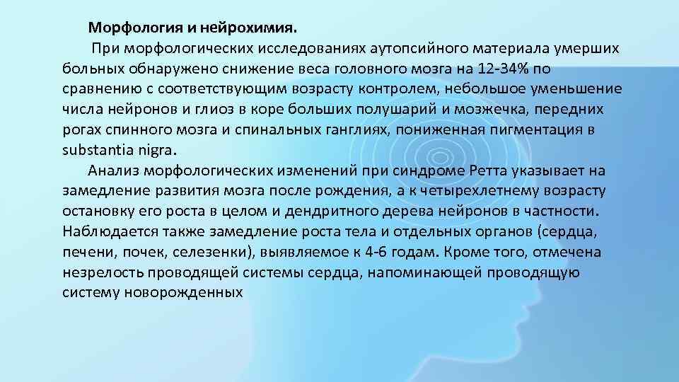 Морфология и нейрохимия. При морфологических исследованиях аутопсийного материала умерших больных обнаружено снижение веса головного мозга на 12 34% по сравнению с соответствующим возрасту контролем, небольшое уменьшение числа нейронов и глиоз в коре больших полушарий и мозжечка, передних рогах спинного мозга и спинальных ганглиях, пониженная пигментация в substantia nigra. Анализ морфологических изменений при синдроме Ретта указывает на замедление развития мозга после рождения, а к четырехлетнему возрасту остановку его роста в целом и дендритного дерева нейронов в частности. Наблюдается также замедление роста тела и отдельных органов (сердца, печени, почек, селезенки), выявляемое к 4 6 годам. Кроме того, отмечена незрелость проводящей системы сердца, напоминающей проводящую систему новорожденных