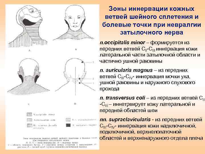 Зоны иннервации кожных ветвей шейного сплетения и болевые точки при невралгии затылочного нерва n. occipitalis minor – формируется из передних ветвей CIII иннервация кожи латеральной части затылочной области и частично ушной раковины n. auricularis magnus – из передних ветвей CIII CIV иннервация мочки уха, ушной раковины и наружного слухового прохода n. transversus coli – из передних ветвей CIII – иннетрвирует кожу латеральной и передней областей шеи nn. supraclavicularis из передних ветвей CIII CIV иннервация кожи надключичной, подключичной, верхнелопаточной областей и верхненаружного отдела плеча