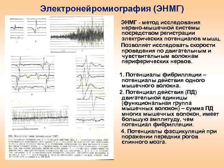 Электронейромиография (ЭНМГ) ЭНМГ - метод исследования нервно-мышечной системы посредством регистрации электрических потенциалов мышц. Позволяет исследовать скорости проведения по двигательным и чувствительным волокнам периферических нервов. 1. Потенциалы фибрилляции – потенциалы действия одного мышечного волокна. 2. Потенциал действия (ПД) двигательной единицы (функциональная группа мышечных волокон) – сумма ПД многих мышечных волокон, имеет большую амплитуду, чем потенциал фибрилляции. 4. Потенциалы фасцикуляций при поражении передних рогов спинного мозга.