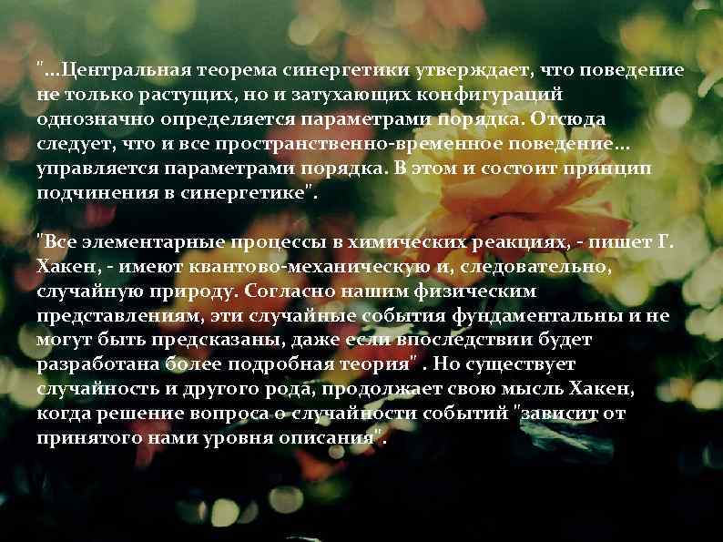". . . Центральная теорема синергетики утверждает, что поведение не только растущих, но и затухающих конфигураций однозначно определяется параметрами порядка. Отсюда следует, что и все пространственно-временное поведение. . . управляется параметрами порядка. В этом и состоит принцип подчинения в синергетике". "Все элементарные процессы в химических реакциях, - пишет Г. Хакен, - имеют квантово-механическую и, следовательно, случайную природу. Согласно нашим физическим представлениям, эти случайные события фундаментальны и не могут быть предсказаны, даже если впоследствии будет разработана более подробная теория". Но существует случайность и другого рода, продолжает свою мысль Хакен, когда решение вопроса о случайности событий "зависит от принятого нами уровня описания".