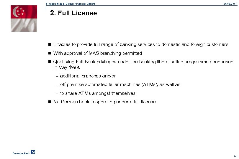 Singapore as a Global Financial Centre 26. 05. 2001 1. Banks and Merchant Banks Merchant Bank Full License Restricted License Offshore License No license but MAS approval Deutsche Bank 9