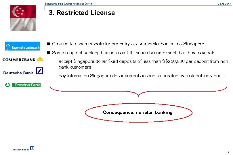 Singapore as a Global Financial Centre 26. 05. 2001 2. Full License n Enables to provide full range of banking services to domestic and foreign customers n With approval of MAS branching permitted n Qualifying Full Bank privileges under the banking liberalisation programme announced in May 1999. – additional branches and/or – off-premise automated teller machines (ATMs), as well as – to share ATMs amongst themselves n No German bank is operating under a full license. Deutsche Bank 10