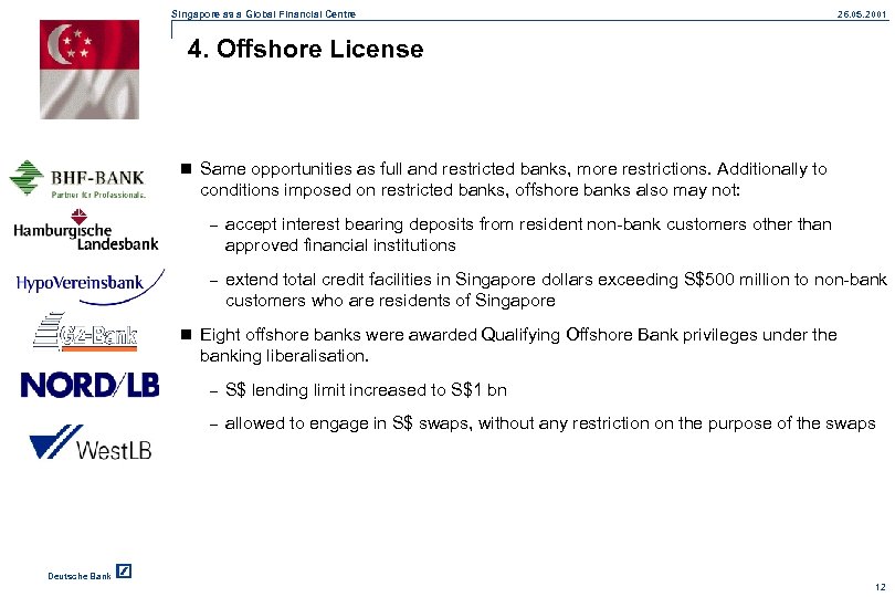 Singapore as a Global Financial Centre 26. 05. 2001 3. Restricted License n Created to accommodate further entry of commercial banks into Singapore n Same range of banking business as full licence banks except that they may not: – accept Singapore dollar fixed deposits of less than S$250, 000 per deposit from nonbank customers – pay interest on Singapore dollar current accounts operated by resident individuals Consequence: no retail banking Deutsche Bank 11