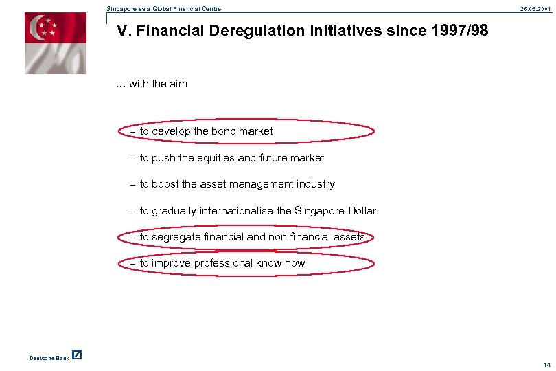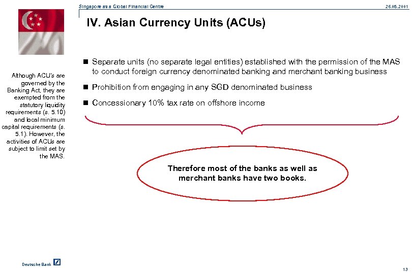 Singapore as a Global Financial Centre 26. 05. 2001 IV. Asian Currency Units (ACUs) n Separate units (no separate legal entities) established with the permission of the MAS Although ACU’s are governed by the Banking Act, they are exempted from the statutory liquidity requirements (s. 5. 10) and local minimum capital requirements (s. 5. 1). However, the activities of ACUs are subject to limit set by the MAS. to conduct foreign currency denominated banking and merchant banking business n Prohibition from engaging in any SGD denominated business n Concessionary 10% tax rate on offshore income Therefore most of the banks as well as merchant banks have two books. Deutsche Bank 13