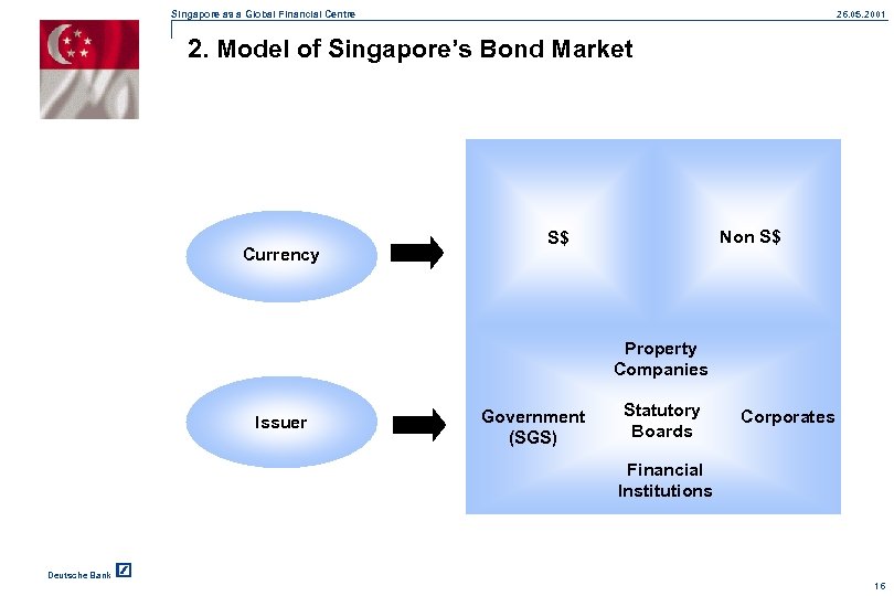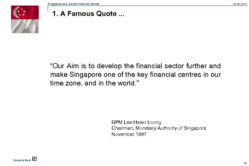 Singapore as a Global Financial Centre 26. 05. 2001 1. A Famous Quote. . . “Our Aim is to develop the financial sector further and make Singapore one of the key financial centres in our time zone, and in the world. ” DPM Lee Hsien Loong Chairman, Monetary Authority of Singapore November 1997 Deutsche Bank 15