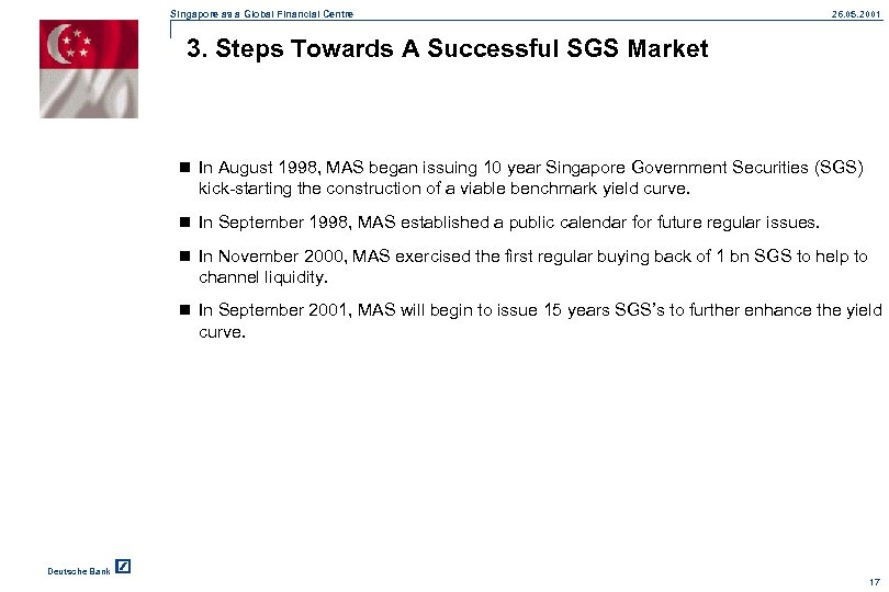 Singapore as a Global Financial Centre 26. 05. 2001 2. Model of Singapore’s Bond Market Currency Non S$ S$ Property Companies Issuer Government (SGS) Statutory Boards Corporates Financial Institutions Deutsche Bank 16