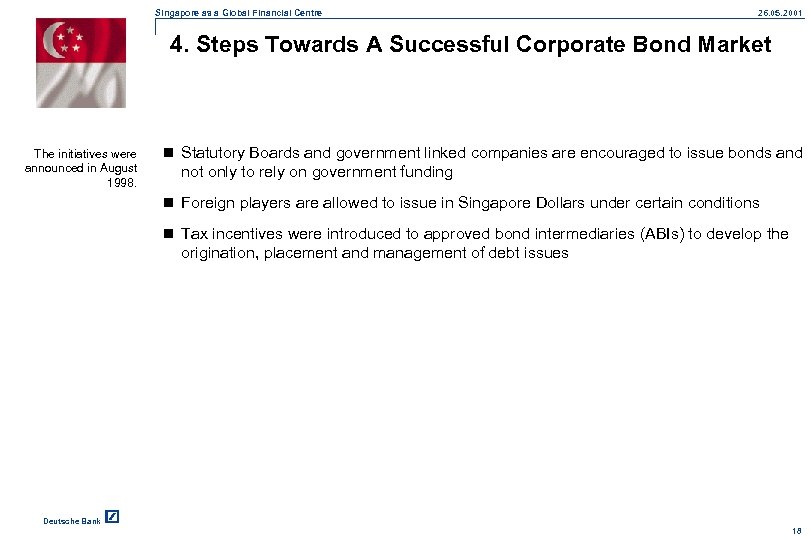 Singapore as a Global Financial Centre 26. 05. 2001 3. Steps Towards A Successful SGS Market n In August 1998, MAS began issuing 10 year Singapore Government Securities (SGS) kick-starting the construction of a viable benchmark yield curve. n In September 1998, MAS established a public calendar for future regular issues. n In November 2000, MAS exercised the first regular buying back of 1 bn SGS to help to channel liquidity. n In September 2001, MAS will begin to issue 15 years SGS’s to further enhance the yield curve. Deutsche Bank 17