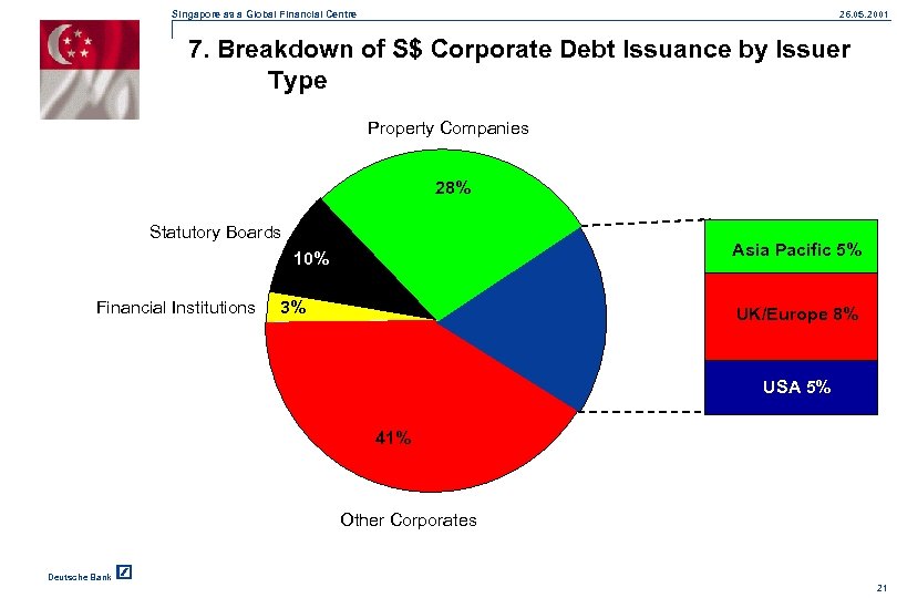 Singapore as a Global Financial Centre 26. 05. 2001 6. Total S$ and Non-S$ Denominated Debt Issuance 50. 5 36. 1 19. 5 8. 5 1. 8 8. 7 4. 5 6. 7 4. 2 1997 In S$ bn 1998 S$ Denominated Debt 10. 3 9. 2 1999 14. 4 2000 Non-S$ Denominated Debt Deutsche Bank 20