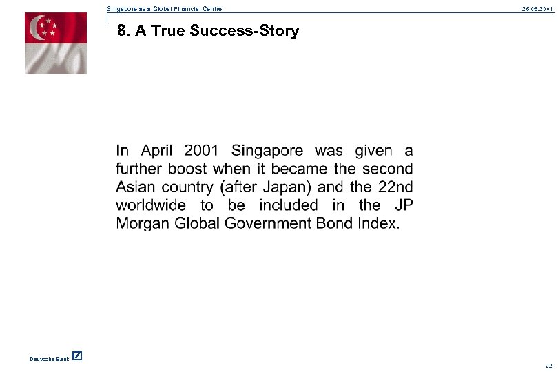 Singapore as a Global Financial Centre 26. 05. 2001 8. A True Success-Story Deutsche Bank 22