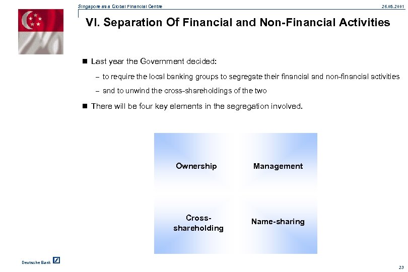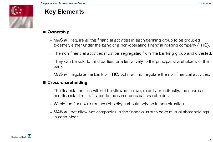Singapore as a Global Financial Centre 26. 05. 2001 VI. Separation Of Financial and Non-Financial Activities n Last year the Government decided: – to require the local banking groups to segregate their financial and non-financial activities – and to unwind the cross-shareholdings of the two n There will be four key elements in the segregation involved. Ownership Management Crossshareholding Name-sharing Deutsche Bank 23